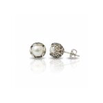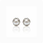 Aretes de plata 950, con perla central esférica y engaste estructural en plata con detalles en relieve. Cuentan con poste y cierre a presión, tamaño compacto y acabado pulido.